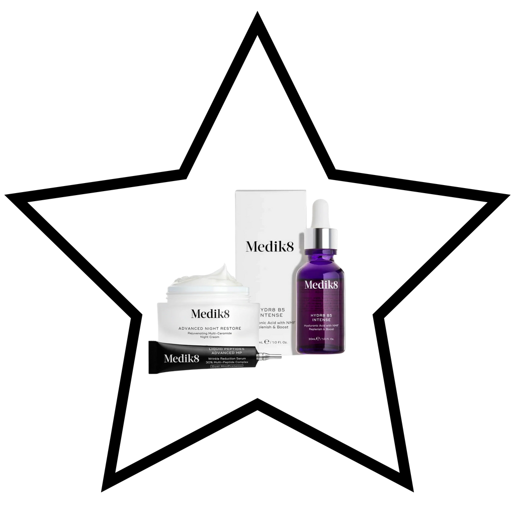 Hydr8 B5 Intense 30ml + Advanced Night Restore 50ml + Free Liquid Peptides MP 4ml Lux Sample. Discover the ultimate firming and hydrating duo with Medik8's Firm Favourites Gift Set.