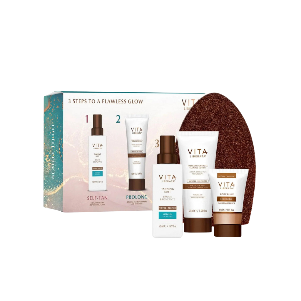 Achieve a radiant golden tan on-the-go with the Vita Liberata Beauty To Go Travel Tanning Kit. This set includes three travel-size tanning products and an ultra-soft mitt for effortless application.